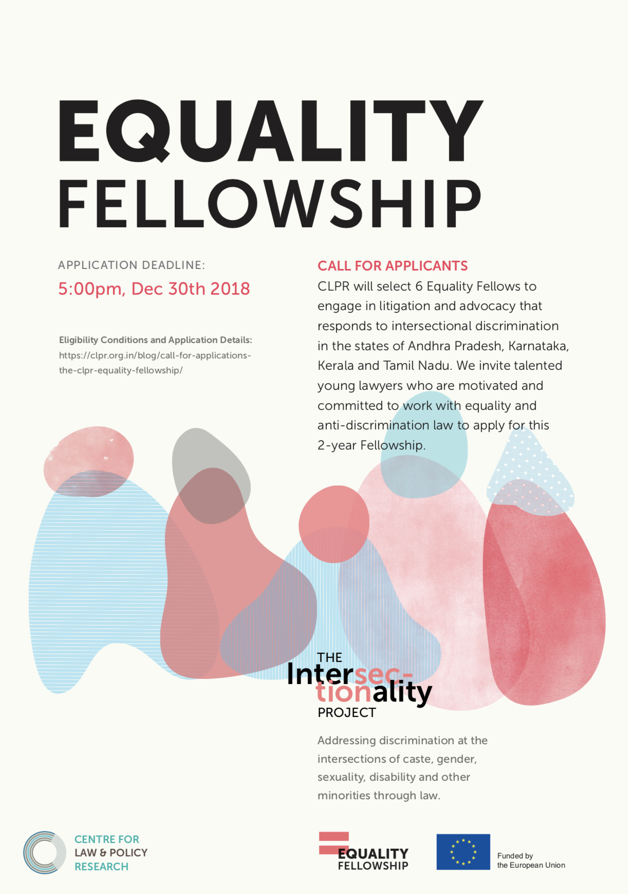 CLPR will select 6 Equality Fellows to engage in litigation and advocacy that responds to intersectional discrimination in the states of Andhra Pradesh, Karnataka, Kerala and Tamil Nadu. We invite young lawyers who are motivated and committed to working with equality and anti-discrimination law to apply for this 2-year Fellowship.