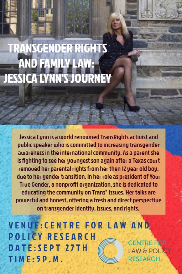 As a part of our CLPR Occassional Talks, Centre for Law and Policy Research (“CLPR”) is proud to host Jessica Lynn on 27th September where she will be talking on Transgender rights and family law, through her personal journey. Jessica Lynn is the president of Your True Gender, a non-profit organisation dedicated to informing the public on transgender issues. She is an advocate, educator and parent who is actively engaged in pressing conversations surrounding the transgender experience. Her talk will cover her transition, sex change and the impact it had on the custody of her youngest son. Due to her transgender status, she lost full parental rights to her youngest son who was 12 years old at the time. She is only parent in U.S. history – a biological parent with a previously active, supportive role in her child’s life – to be removed off of their child’s birth certificate.