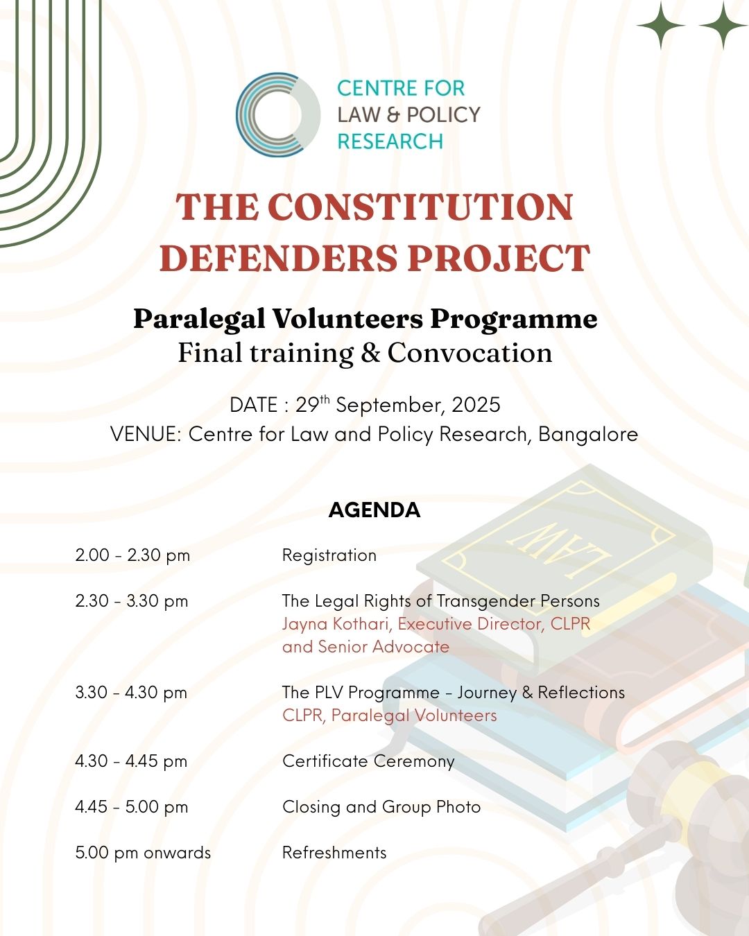 On the 29th of September 2024, CLPR will host a training program dedicated to furthering the understanding of the Legal Rights of Transgender Persons. The event will also include the Convocation ceremony for our Paralegal Volunteers (PLVs).